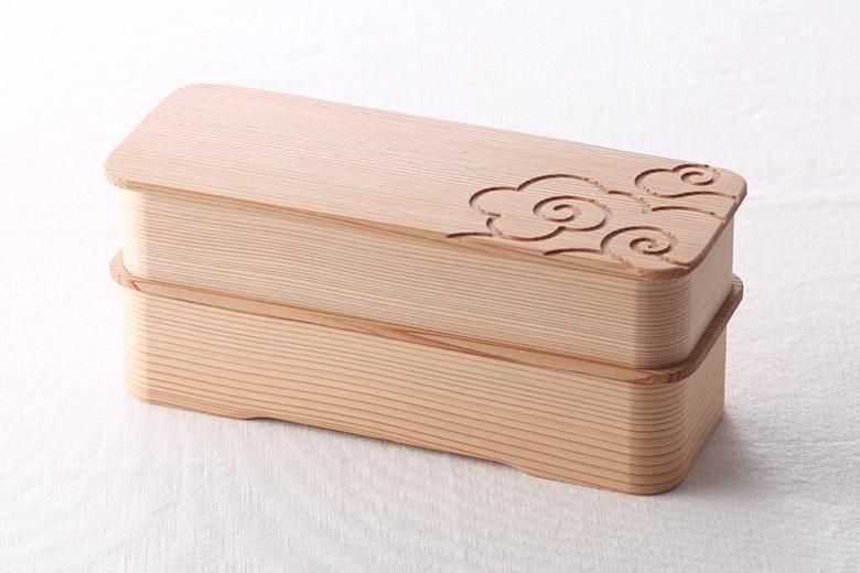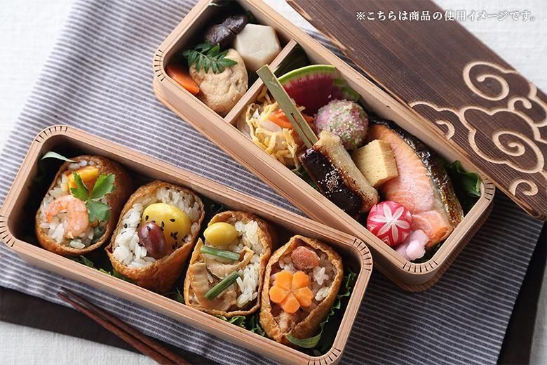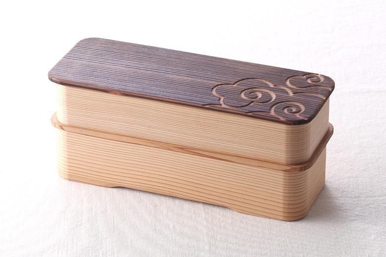 通勤、通学にかばんに収まりやすい人気の細長二段のお弁当箱。容量も男性や学生に嬉しいしっかり800ml。白木の白刻・焼杉の黒刻の2色の蓋からお選びいただけます。取り外し可能な2枚の仕切り付き。手のひらに収まる足クリ加工によってお茶碗のように手にもってご飯を食べることができます。上段におかず・下段にご飯の二段使い、一段ずつでもお使いいただけます。