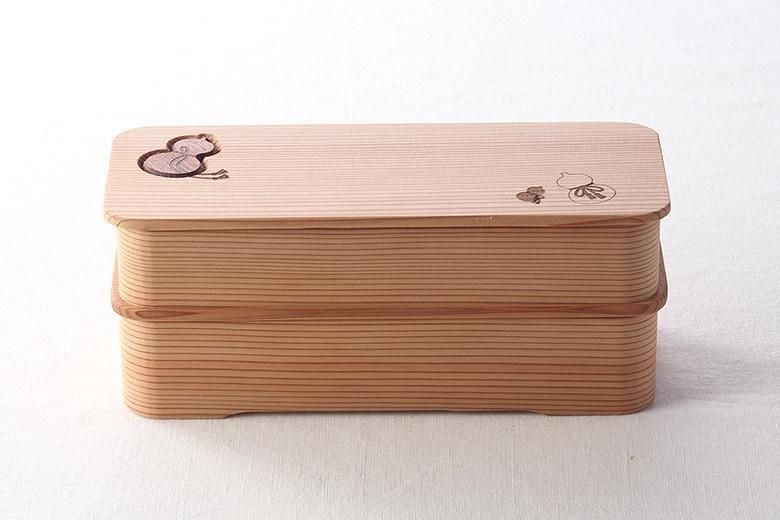 通勤、通学にかばんに収まりやすい人気の細長二段のお弁当箱。容量も男性や学生に嬉しいしっかり800ml。蓋は白木のみになります。取り外し可能な2枚の仕切り付き。手のひらに収まる足クリ加工によってお茶碗のように手にもってご飯を食べることができます。上段におかず・下段にご飯の二段使い、一段ずつでもお使いいただけます。