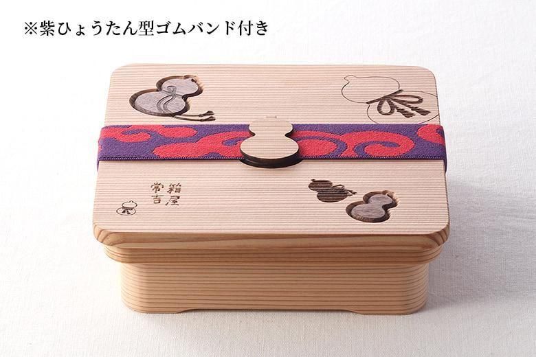 5寸 700mlの便利な松花堂弁当箱に瓢箪柄が登場。白木の白刻のみのお取り扱いとなります。取り外し可能な十字仕切り付き。マグネットを仕込んだ真ん中の瓢箪が箸置きになり、食卓を楽しく華やかに彩ります。箸置き瓢箪を取り外すと、ぴったりハマる紫の瓢箪型ゴムバンド付き。瓢箪の箸置きは、この松花堂弁当箱だけの特別仕様です!