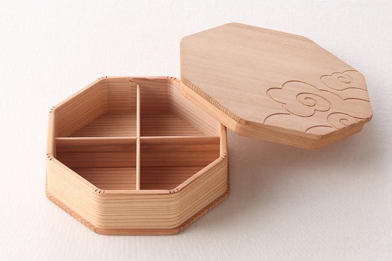 人気インスタグラマーまみさん@vivienne_glow プロデュース第一弾の八角一段弁当箱。白木の白刻・焼杉の黒刻の2色の蓋からお選びいただけます。取り外し可能な十字仕切り付き。便利な750mlの容量とこだわりの4cmの深さが詰めやすいGOODサイズ!物相や手毬寿司、小鉢使いの演出も映え、詰めるのがワクワク楽しくなります。
