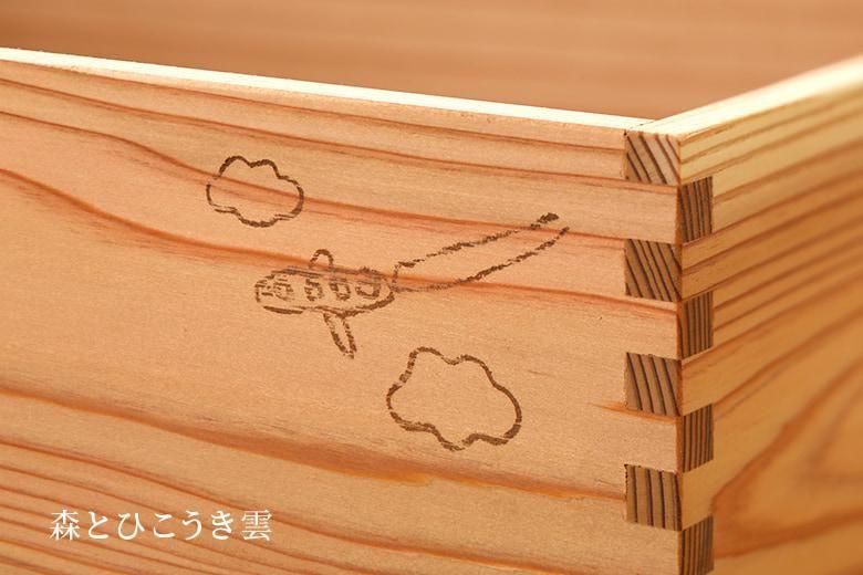 収納箱は白木で、「鳥の家族」「森とひこうき雲」の2柄からお選びいただけます。おもちゃやぬいぐるみなど大事なものを入れてしてください。木の経年変化を楽しみながら長くお使いいただき、大人になってからも様々な自分にとっての宝物を収納してください。