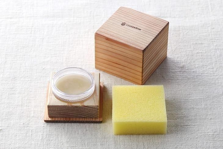 ミツバチの巣を構成する蝋を精製した蜜ロウと、お弁当箱や木工製品製造過程で出たおが屑から自社で抽出した杉精油に、木材のお手入れに適した乾油性の食用クルミオイルを混ぜた、お子様が口にしても安心な100%自然素材のケア用品です。