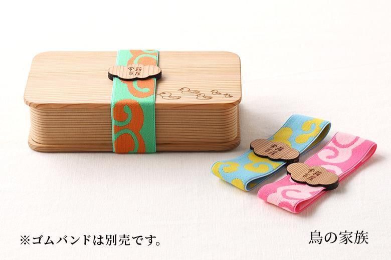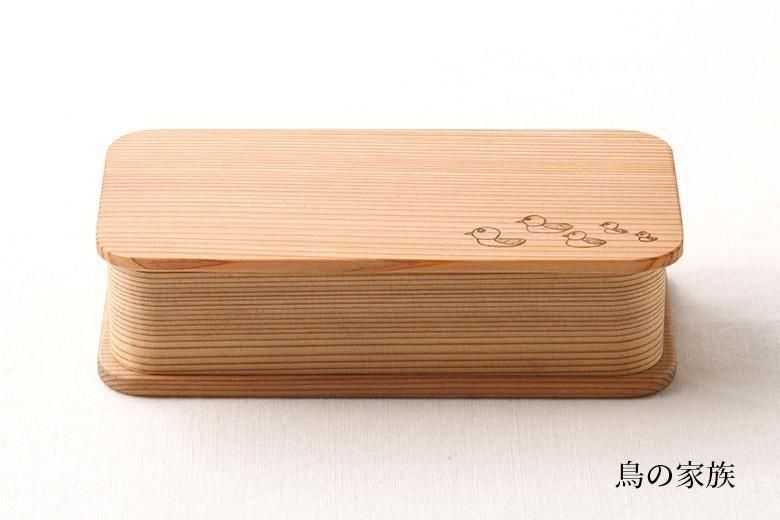 お弁当箱の蓋はいずれも白木で、「鳥の家族」「ひこうき雲」「森とちょうちょ」の3柄からお選びいただけます。取り外し可能で便利な1枚の仕切り付。年少さん向け容量300mlで、かばんに収まりやすく詰めやすい細長型、貼り底・乗せ蓋の軽くて箱屋常吉で最小容量のお弁当箱です。
